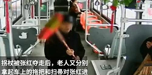 而张红只得丢下自己手中的拐杖,抓住向她身上砸来的拖把。随后,有一位女乘客站了出来,帮司机说话。但老人根本不听她的劝告,蹲下身捡起自己的拐杖,往张红和女乘客的身上狠狠的打去。