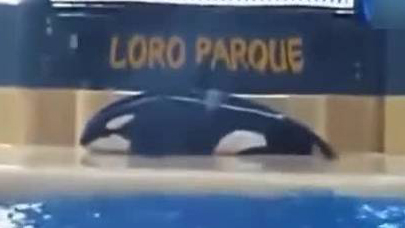 实拍虎鲸表演后平躺台上欲自杀