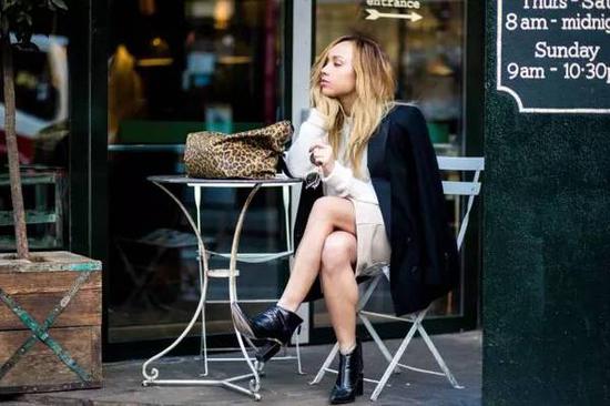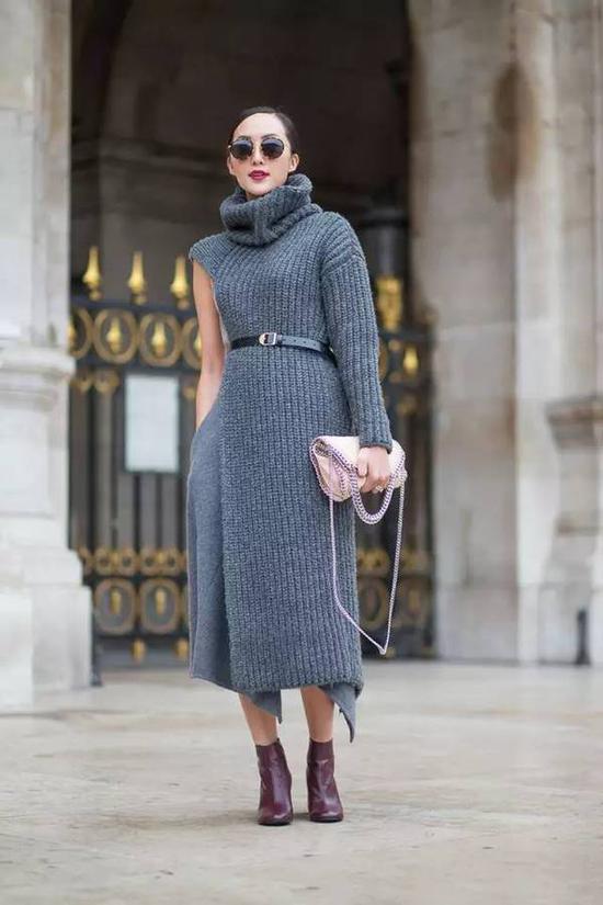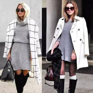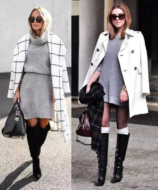 白色大衣+灰色针织裙也很好看,细针织视觉上更有质感,粗针织则增加纹理细节,这种组合不挑身材,搭配一双长靴御寒又时髦,配上黑色皮裙和尖头鞋,完全可以代言极致性感。