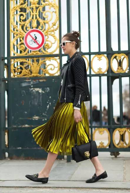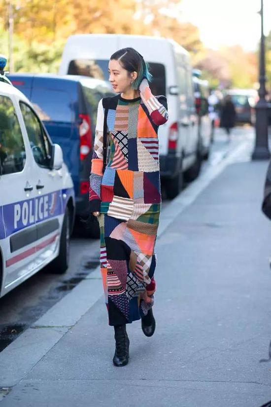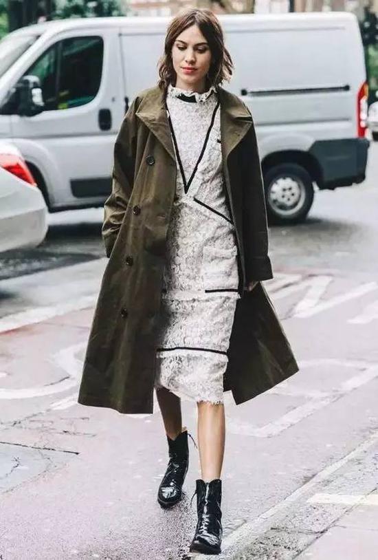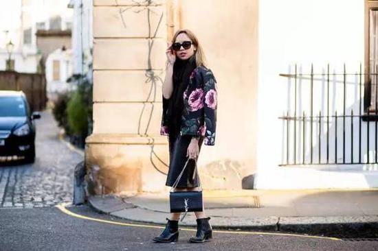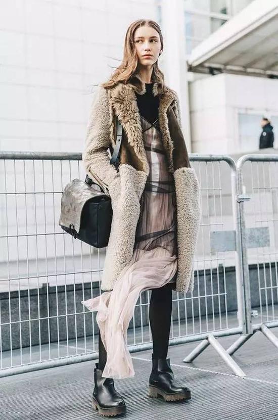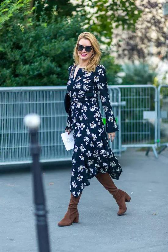 褶裙效果最好,仙气十足。未来感的金属色百褶中裙足够吸睛,冷的话,记得加上裤袜。夏天的印花连衣裙不要收进衣柜,加上长筒靴,妥妥的变为秋冬新宠。深色底的印花更适合冬天。