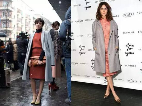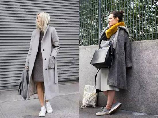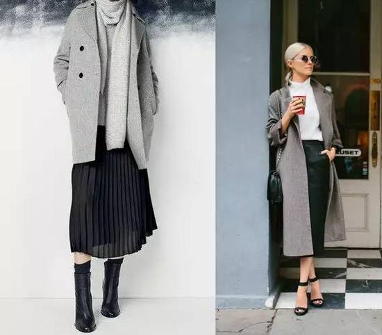 灰色大衣是秋冬衣橱的基础款,耐脏又显气质。选择同色系裙子的方法最简单。想要干练的选挺挺括版型+修身中裙,想要休闲风的选连帽大衣+阔摆中裙,性冷淡风的加同色围巾,不想要太沉闷可以选亮色。
