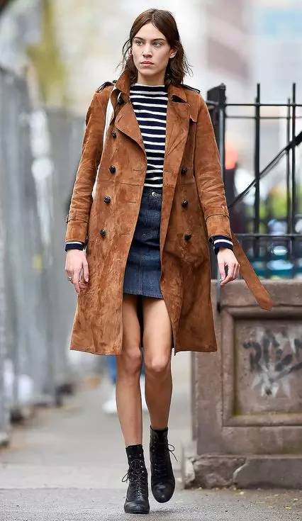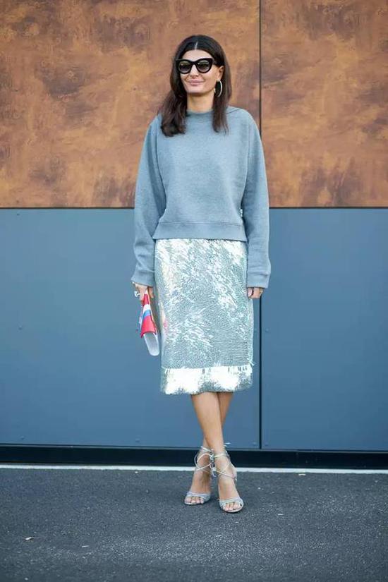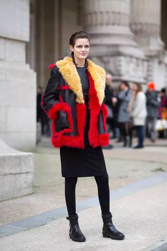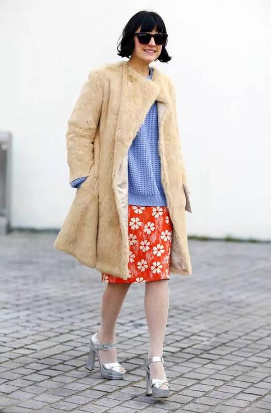 裙子长度的选择也有技巧。阔摆短裙+裤袜最基础,和毛衣一起凸显少女感。夏天的牛仔A字裙做内搭,拉高腰线,搭配长大衣修饰线条,高挑到没朋友。中裙是造型利器,露出来的小腿足够显瘦,撑起皮草大衣无压力,大胆的印花非常有个性。或者反过来,你也可以用低调的铅笔裙配艳色大衣,中裙+卫衣是最凸显女人味,又绝不会用力过度的组合。如果能强调纤细的脚踝,效果更佳。褶边长裙更为优雅,和同色系大衣搭配,只需要简约的发型和耳饰装点,就很有气质。