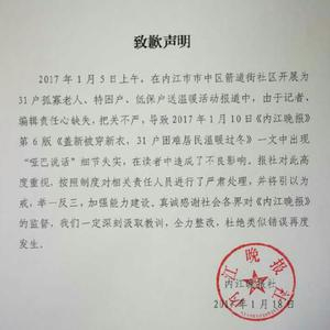 就此,中共内江市委宣传部发表“致歉声明”,指出在内江市市中区箭道街社区开展为31户孤寡老人送温暖活动报道中,由于记者、编辑责任心缺失,把关不严,导致1月10日《内江晚报》一文中出现“哑巴说话”细节失实,在读者中造成了不良影响。声明称,内江晚报社对此高度重视,按照制度对相关责任人员进行了严肃处理,并将引以为戒,举一反三,加强能力建设。四川内江回应“哑巴群众说话”:话是受访时写纸上的。