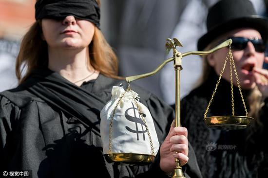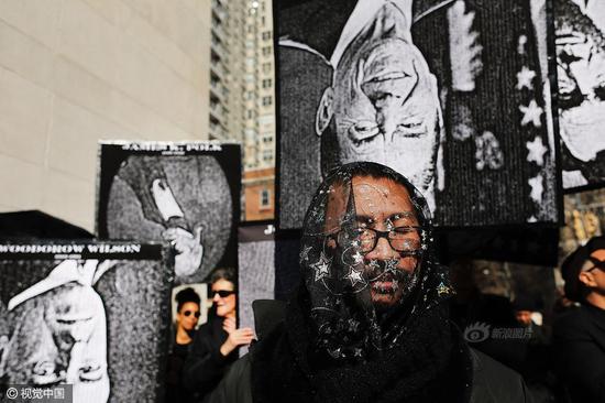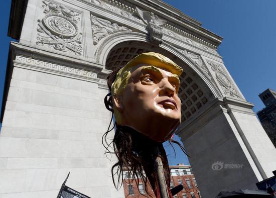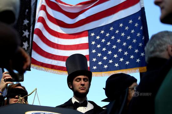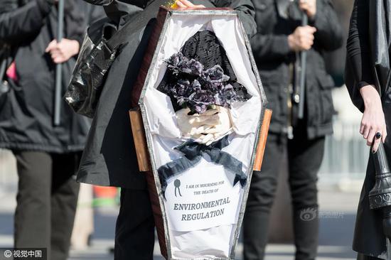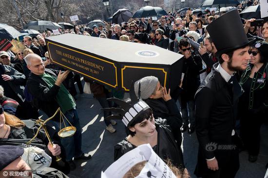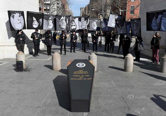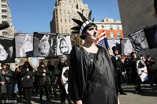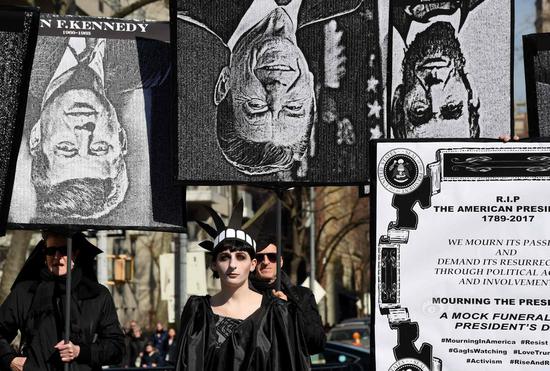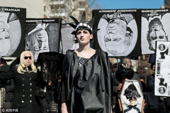 11张2月18日,美国纽约,美国总统日后的周末(总统日:每年二月的第三个星期一),纽约组织“Rise and Resist”和“GAG Is Watching”成员在华盛顿广场公园举行新奥尔良爵士风格葬礼游行活动,哀悼“美国总统之死”,抗议特朗普政策。