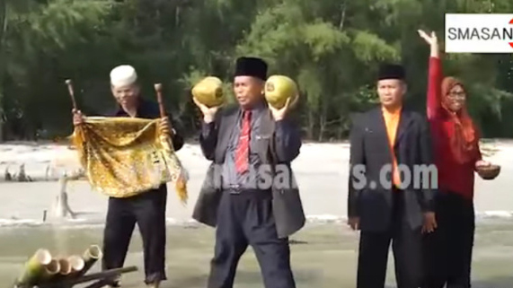 他在海滩和3名助手一起赤脚站在水中,手持椰子、地毯和海水,海滩上还插有5枝竹子。
