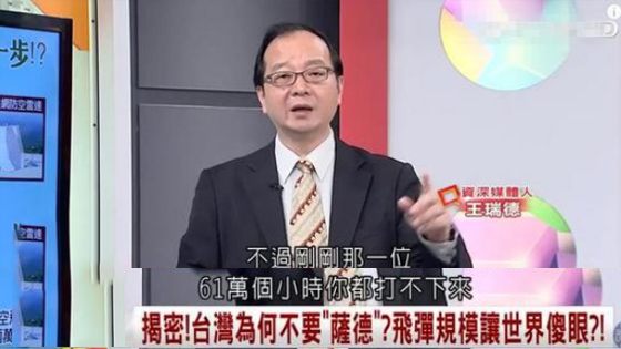 王瑞德在节目中还表示,台湾有各式各样的导弹,多到军方自己可能都搞不清楚,想以此警告大陆“我虽小你要拿下我,也要付出你的代价。”
