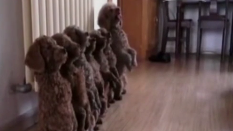 因为他的“军事化”管理、训练,他的7只泰迪狗狗能够做出整齐划一的动作。