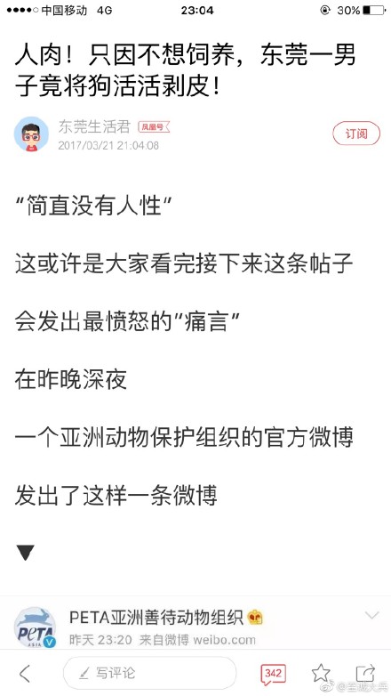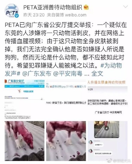 事件惹来大批网友谴责,亚洲善待动物组织(PETA)周一亦在其官方微博谴责剥皮虐狗事件,又表示已向广东警方报案。