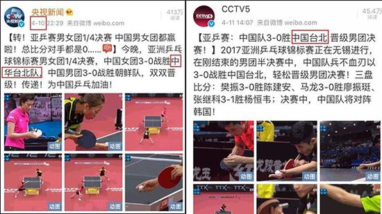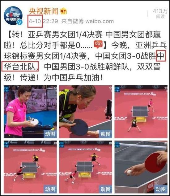 在4月10日及之前,央视的称呼还是“中华台北队”,但从11日开始,央视开始改称“中国台北队”!同样改变称呼的还有央视新闻和新华网。