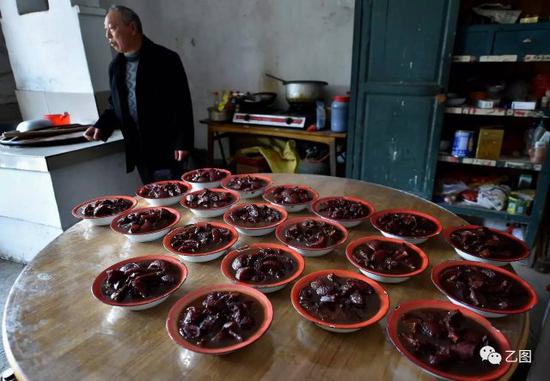 安徽大别山深处金寨县古碑镇的一间民房里,闻业权老人正在忙着烧红烧肉,今天老人专门杀了两头猪,烧了 40 碗红烧肉。这几年来老人专门烧红烧肉,供不应求。买红烧肉常常要提前一个星期预约。一年里,老人要杀掉 200 多头猪,烧 4000 多碗红烧肉。