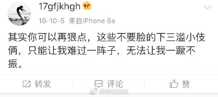 比巴卜泡泡泡糖:她发的那些什么某人整他,专情的人最无情什么的,说真的哎,如果是我,我和我男朋友公布恋情的时候,前女友来这儿上眼药蹭热度,我明面上绝对不会说什么,但是背地里会搞屎她的好嘛。你俩已经分手了,分手了,你算个毛线球在这儿逼逼叨叨,这个男人起码现在未来都属于我了。