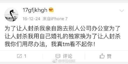 李铃铛哒:张馨予小号曝光!疑似张馨予小号的微博里说某人不断打压她,让她多次失去工作,角色被取代,更有人亲自出马对她赶尽杀绝,甚至用两人独家婚礼报道要求封杀她……