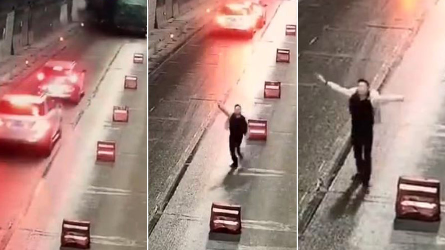 隧道内发生车祸 他下车挥手示意后车减速仍被撞