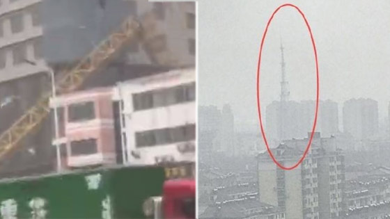 惊险实拍:阜宁一塔吊被大风拦腰折断