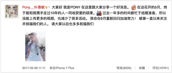 5月9日,韩国美妆红人朴惠敏PONY微博发文,宣布婚讯。她称:“在这花开的5月,终于能和我携手走过10年的人一同收获爱的硕果。”网友纷纷为她送上祝福。
