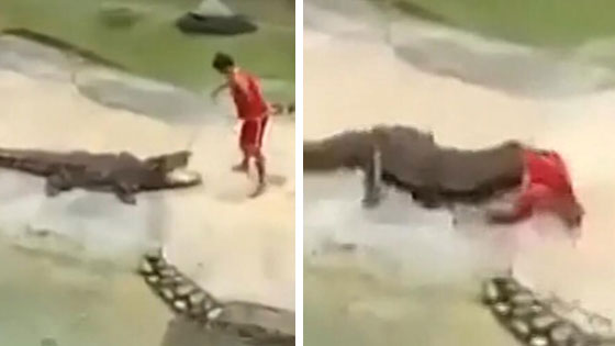 巨大鳄鱼咬住表演者脖颈 身体猛甩
