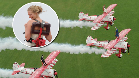 极限神人办空中结婚典礼 新娘用绳子绑机翼上