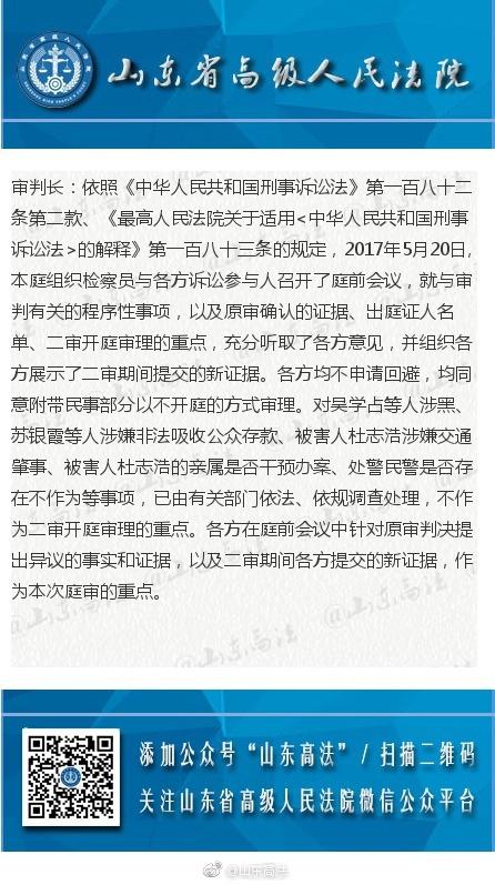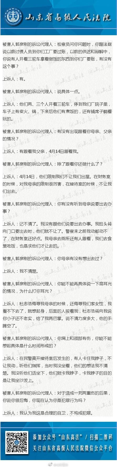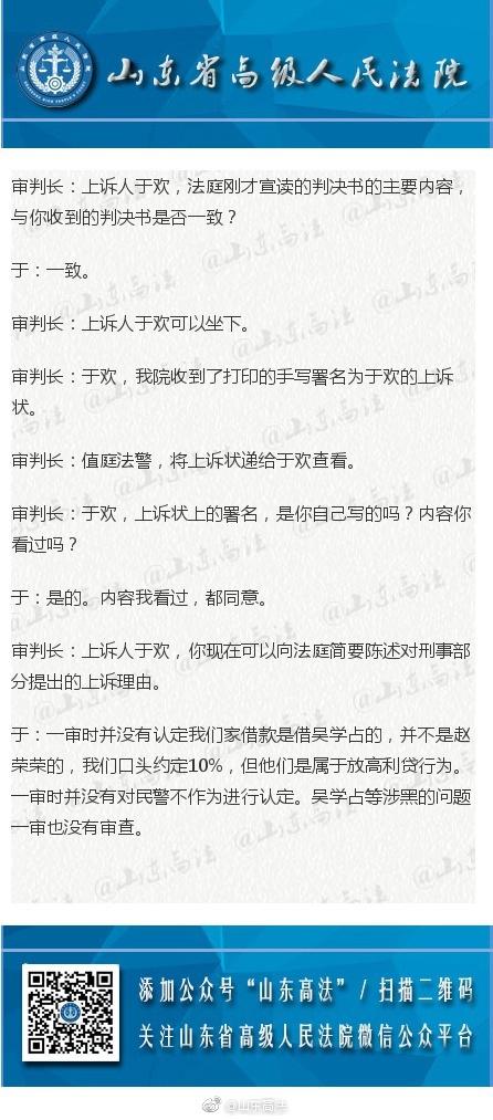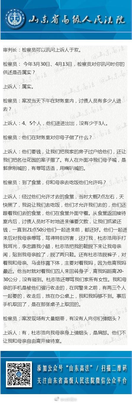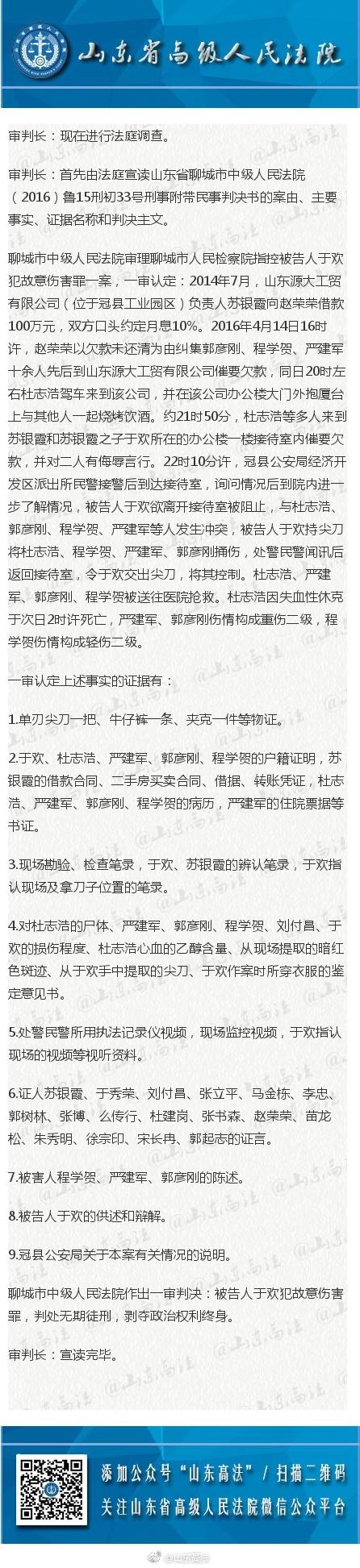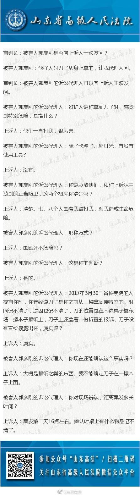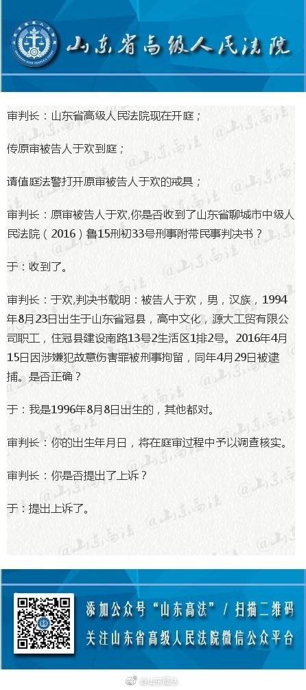 今天8时32分,山东省高级人民法院依法公开开庭审理于欢故意伤害上诉案。2016年4月,山东源大工贸负责人苏银霞及其子于欢,被11名催债人限制人身自由并受到侮辱。于欢刺伤4人,其中1人死亡。于欢一审被以故意伤害罪判处无期徒刑。