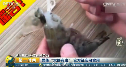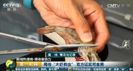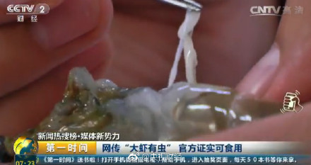 近期一段关于“对虾体内有寄生虫”的视频在朋友圈大肆传播。一女子用剪刀剪开对虾的颈部,挤出几条白色线状固体,并称这就是虾体内的寄生虫,每只虾都有。经证实所谓“虫”是雄虾生殖腺,也就是输精管或贮精囊,大约相当于鱼白、蟹膏,可食用。