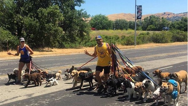 训犬师Zane和Lisa是对情侣,他们在美国加州开设遛狗服务,他们的“客户”数量非常壮观,常常需要同时遛几十只狗。
