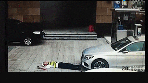 保安为阻奔驰车进停车场躺在车前