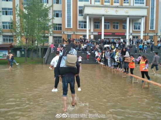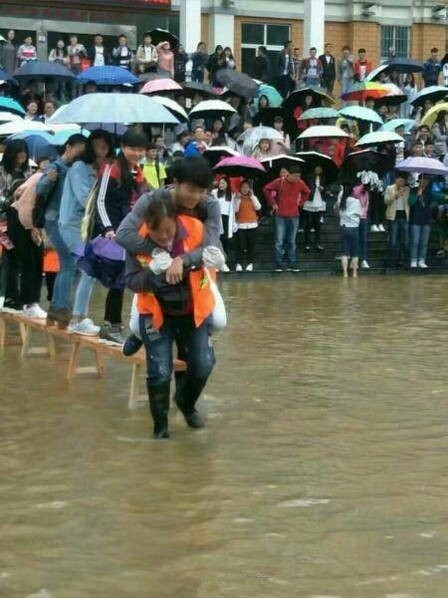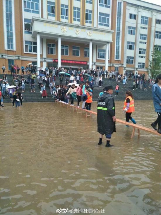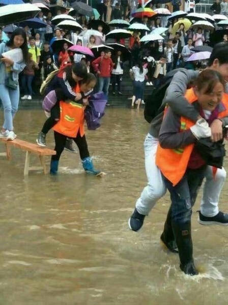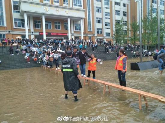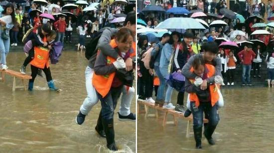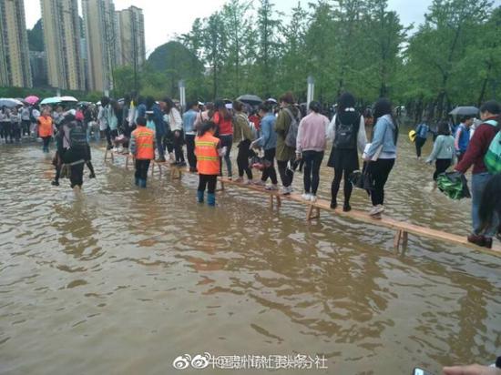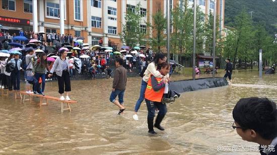 6月14日,贵州部分地区降暴雨,六盘水师范学院低洼地带形成积水。15日上午,校方安排8名清洁工用长凳在主教学楼前搭起了“水中桥”,并在水中来回背着学生过“河”,此举引发网友热议。