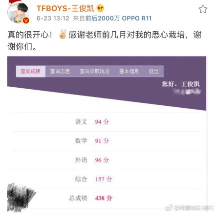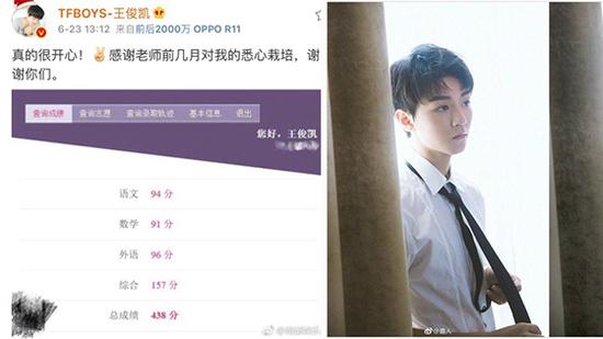 6月23日,TFBOYS队长王俊凯高考成绩出炉,总分438分,语文94分,数学91分,外语96分,综合157分。王俊凯晒出成绩单并表示:“真的很开心!感谢老师前几月对我的悉心栽培,谢谢你们。 ”