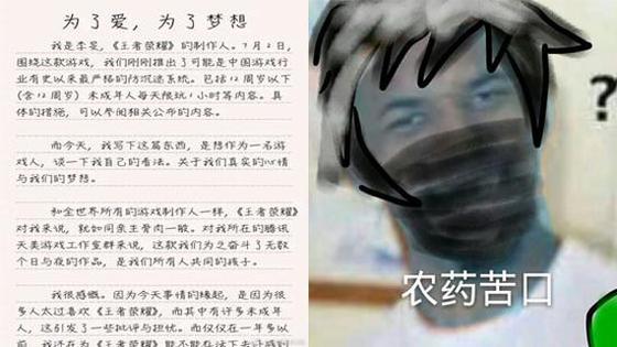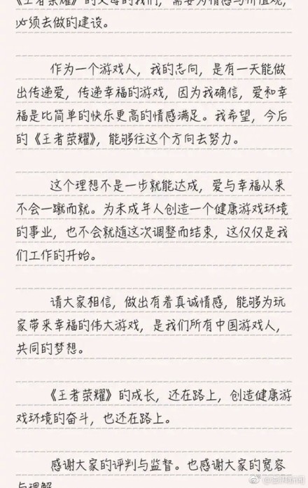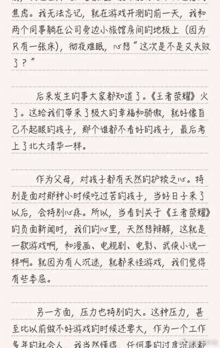 “《王者荣耀》火了。这给我们带来了极大的幸福和骄傲,就好像自己不起眼的孩子,那个谁都不看好的孩子,最后考上了北大清华一样。”李旻在公开信中写到。