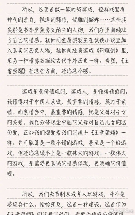 李旻称,“我充分体谅全中国的父母对自己儿女的这份爱,正如我们深爱着我们的孩子《王者荣耀》一样。”