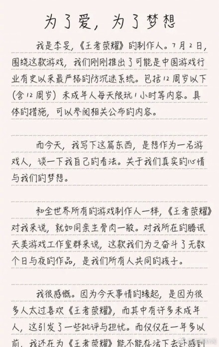 7月3日,腾讯游戏在其官方微信号上发布《王者荣耀》制作人李旻的公开信,对于近期腾讯游戏推出的防沉迷系统,作出详细说明。