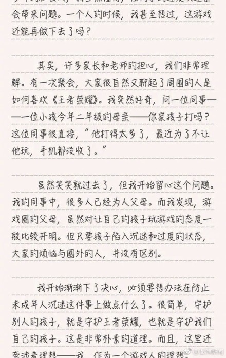 “我们去节制未成年人玩游戏,并不是要放弃什么。恰恰相反,这是一种建设。这是作为《王者荣耀》的父母的我们,需要为情感与价值观,必须去做的建设。”