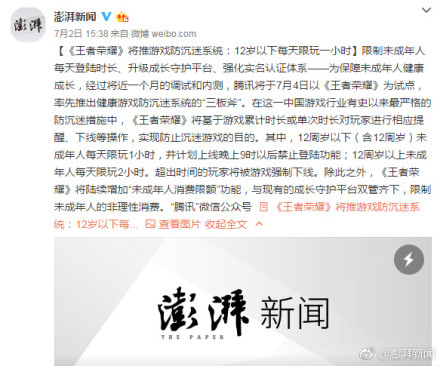 近日,腾讯宣布,将于7月4日以《王者荣耀》为试点,率先推出健康游戏防沉迷系统的“三板斧”。第一板斧便是限制未成年人每天的登陆时长。其中,12周岁以下(含12周岁)未成年人每天限玩1小时,并计划上线晚上9时以后禁止登陆功能;12周岁以上未成年人每天限玩2小时。超出时间的玩家将被游戏强制下线。