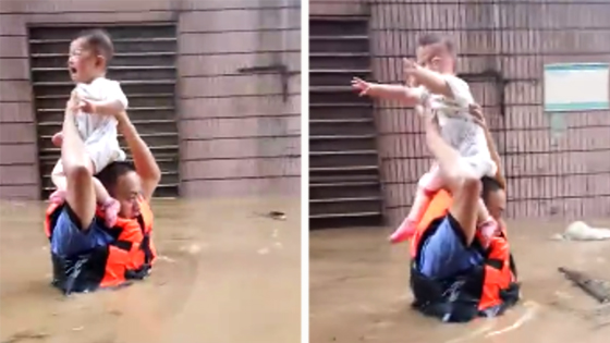 齐胸洪水中感人一幕:宝贝不哭 有叔叔在