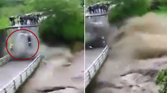 两男子站桥上围观洪水 下一秒桥断了