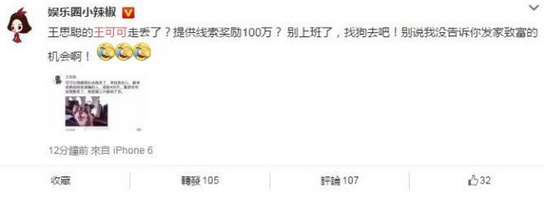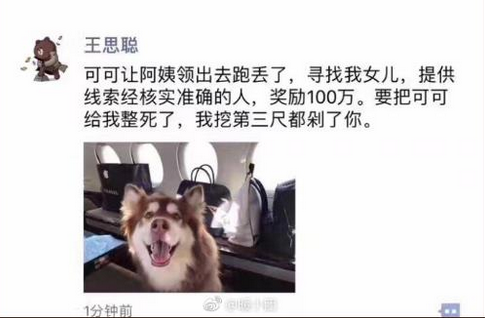 6张7月5日中午,有网友发出疑似王思聪的朋友圈截图,截图中显示,王思聪家的狗“王可可”丢了,王思聪还悬赏100万找狗。王可可的微博“王可可是个碧池”的评论里,立刻就充满了各种“求证”“这是不是真的?”“狗丢了?”的询问。