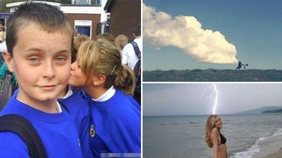 女同学在亲吻自己的闺蜜,这个角度就像是在亲吻,前面的男同学,就是男同学的头有点大了。一道闪电劈下,这个抓拍瞬间,让人感觉就像是闪电劈在了女子头上,如同上天在恩赐着什么!