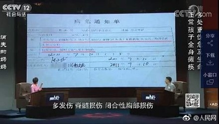 11月12日,央视12--社会与法频道《律师来了》节目以《消失的妈妈》为题,报道了陕西省神木市的货车司机闫彩斌痛诉妻子怀第二胎时,因神官算命称其腹中的孩子与其相克,为此妻子吃打胎药未将胎儿打掉。于是在怀胎四五个月时,向他提出做人流手术,他未同意。最终妻子生下孩子,取名旗旗。满月后,闫彩斌将旗旗送到农村父母家照料。闫彩斌称旗旗长到三岁,被他妻子从父母家接了回来。结果不到一个多月,妻子竟将旗旗痛打的瘫痪在床,医院下发的病危通知书显示:患儿颈髓损伤、闭合性胸部损伤,肺挫伤、肺炎、胸腔积液,身上多处骨折。后经辗转多家医院,终于救回来一条命。事发40多天后,闫彩斌才选择了报警。警方以没有证据证明有所控告的犯罪事实为由,不予立案。再后来,闫彩斌发现妻子出轨他人,被他捉奸在床。最终妻子跟着情夫离家出走,一晃六年到现在,旗旗在爱心妈妈公益慈善组织地不断接力下,于上海复旦大学附属儿科医院做保健康复治疗。目前肩关节、肘关节功能均有所恢复,大小便不再失禁,可以挨着墙角站立一分钟。此时,闫彩斌向央视《律师来了》节目组求助,提出追究妻子虐待抛弃孩子、进而出轨与他人结婚的法律责任。最终,他通过此节目选定了上海海华永泰律师事务所严嫣律师为他代理此案↓↓↓