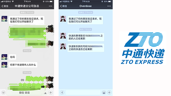 而另一个微信,小柔怀疑是涉案快递员的号码,发来两条微信,重复说了两遍“快递的事情联系1508855xxxx,之前的人已经离职。”小柔称,不知道是中通从警方拿走了涉案快递员的“工作电话”,还是嫌疑人在警方刑拘之前发出的“尽职尽责”的通告。