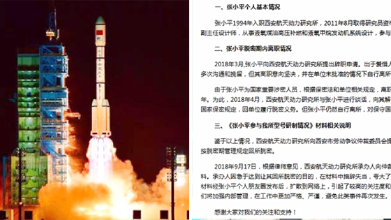 文章中称,一家航天科研机构的研究员张小平被一家民营企业挖走,而该名科研人员离职前在我国大推力火箭发动机研制过程中处于“最关键的技术岗位”。