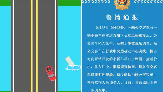 10月28日下午,据平安万州通报:经初步事故现场调查,系公交客车在行驶中突然越过中心实线,撞击对向正常行驶的小轿车后冲上路沿,撞断护栏,坠入江中。根据调查访问、调取公交客车沿线监控视频,初步确认当时公交客车上共有驾乘人员10多人。