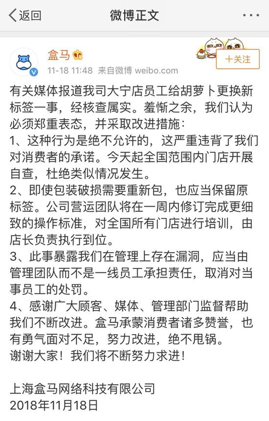 在接到市民在12331和12315两个平台的举报后,执法人员当日即赶到盒马鲜生大宁店进行现场检查,门店负责人承认,店员违规操作,对“崇明胡萝卜”产品进行了标签更换。