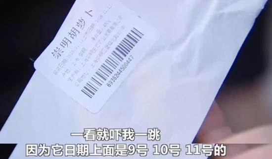 8张此事被爆出,多亏热心市民方先生。方先生前几天在盒马鲜生大宁店购物时,看见一旁的工作人员正在更换胡萝卜外包装的日期标签,被换下的胡萝卜标签日期为11月9日、10日、11日,被换上的标签日期为11月15日。