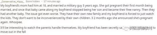 很期待他们手忙脚乱自己照顾孩子的样子。我男友已经在悄悄攒钱,以备今年秋天上大学后搬出去住了。”