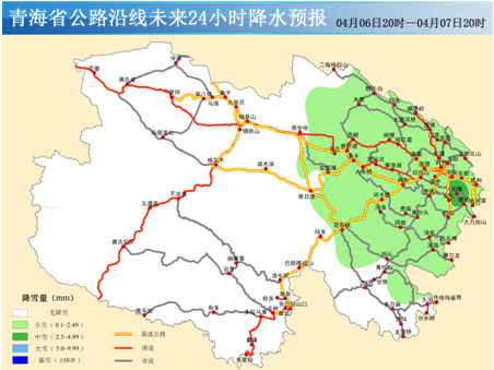 G109京拉线,K2060-K2097路面有积雪,K2098-K2110路面积雪比较严重,龙羊峡岔口至共和部分路段路面湿滑;大水桥西至旺尕秀路段正在降雪。