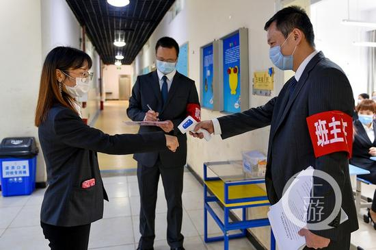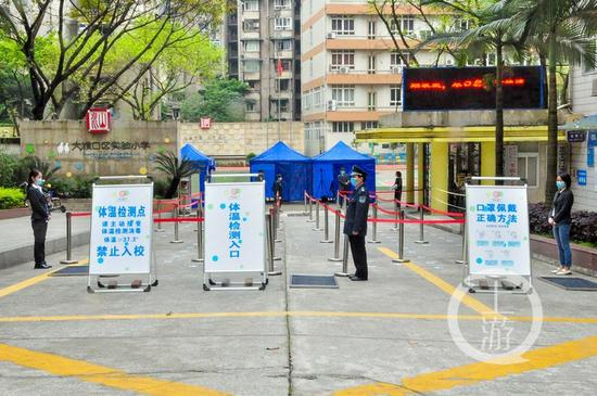 在重庆市人民(融侨)小学,针对即将返校的学生,学校在侧校门安装了红外热成像测温系统,同学们进入学校将通过侧门按照划线距离,依次排队有序进入。体温正常才能从通道进入校园。