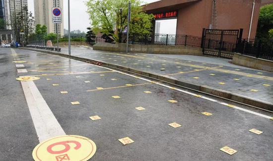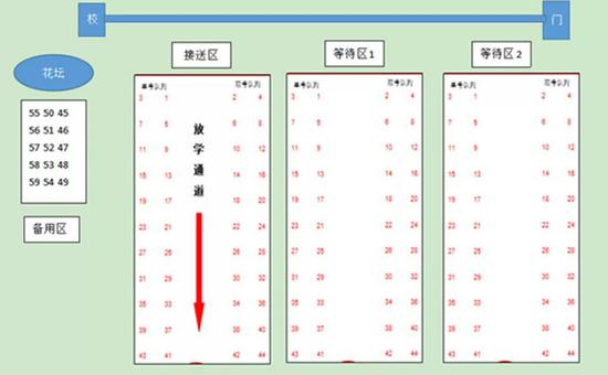 在不同时段,这8个等待区分别对应不同的班级。等待区内部按照纵横各1米的间距要求,粘贴了数十个学号,家长走入等待区,站在孩子的学号点位上就可安静等候孩子放学。