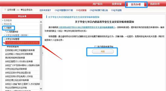 ◾ 2。参保单位通过“业务办理→人才服务→大学生补贴管理→毕业七年以内的高校毕业生生活补贴”进入申报界面。