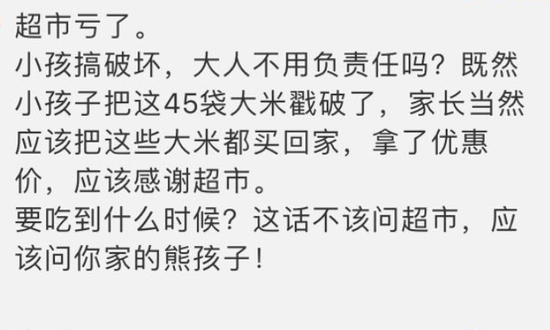 近日江苏南京六合区的雄州派出所接到某超市负责人报警,称和一名顾客发生了纠纷,原来顾客的 “ 熊孩子 ” 用牙签将超市内 45 袋真空包装的大米戳破,双方争执不下。