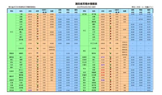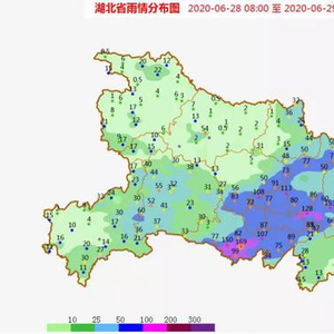 雨情方面,6月28日8时至29日8时,江汉平原、鄂东北大到暴雨局部大暴雨,鄂东南北部大到暴雨,鄂西南中到大雨局地暴雨,省内其他地区小雨为主。