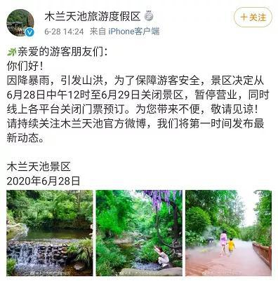 你们好!因降暴雨,引发山洪,为了保障游客安全,景区决定从6月28日中午12时至6月29日关闭景区,暂停营业,同时线上各平台关闭门票预订。为您带来不便,敬请见谅!请持续关注木兰天池官方微信,我们将第一时间发布最新动态。